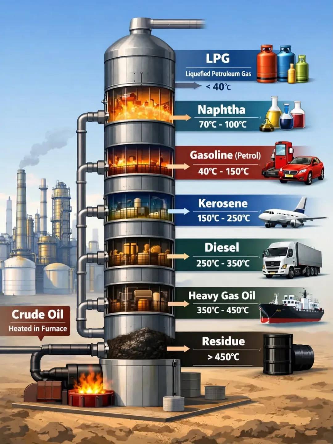The process begins at a furnace at the base of the refinery system, where crude oil is superheated until it transforms into a churning mixture of hot vapours and liquids. This mixture is then fed into a tall steel structure called a distillation column — the centre piece of any refinery. Inside the column, a temperature gradient is carefully maintained: extremely hot at the bottom, and progressively cooler toward the top. It is this temperature ladder that does the sorting.