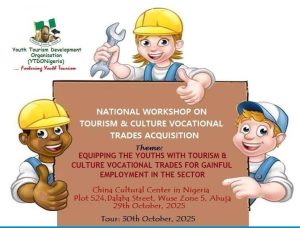 The National Workshop on Tourism and Culture Vocational Trades Acquisition is scheduled to hold in Abuja from October 29th to 30th 2025 in Abuja the Federal Capital City. This workshop is put together by Youth Tourism Development Organization, YTDONigeria.