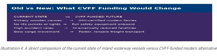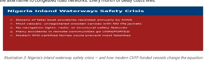 The statistics surrounding inland waterway accidents in Nigeria are deeply troubling. The National Inland Waterways Authority (NIWA) has consistently reported dozens of fatal boat mishaps annually, with many incidents going unrecorded in remote riverine communities. In most cases, the vessels involved are wooden boats with no life jackets, no navigation lights, no radio communication equipment, and no structural integrity to withstand even mild weather conditions. Deploying CVFF funds to procure modern, certified ferry boats — built to International Maritime Organization (IMO) standards — would dramatically reduce fatalities and instil public confidence in water transport as a safe alternative to congested road networks.