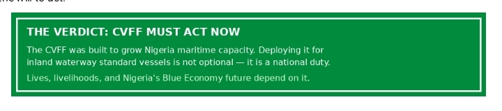 The CVFF was created to grow Nigeria’s indigenous maritime capacity — and there is no more urgent application of that mandate than fixing the country’s dangerously neglected inland waterways. Maritime authorities, the National Assembly, state governments, and the organised private sector must align behind a clear, time-bound programme to deploy CVFF resources for the acquisition and distribution of standard ferry boats across Nigeria’s inland waterway network. The lives of millions of Nigerians who depend on these routes every day demand nothing less. Nigeria’s waterways must become an asset, not a liability — and the CVFF is the most immediate and appropriate tool to make that transformation happen.